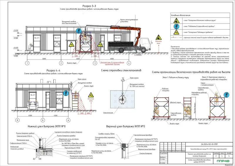 По роду своей деятельности специалистам нашей компании приходится часто сталкиваться с разработкой ППР на монтаж витражных конструкций с каркасами выполненными из различных материалов - от деревянных до ПВХ (пластик). Но наибольшее распространение получили каркасы из алюминия. Наиважнейшие отличительные особенности создания такого проекта лежат исходных данных на основе которого он разрабатывается. Как правило это раздел РД - АР или даже КМД. АР помогает понять нашим инженерам общую характеристику фасада здания посмотреть план кровли, чтобы определить конфигурацию размещения средств подмащивания (строительные леса, фасадные подъемники и т.д.). Таким образом АР позволяет создать нам первую часть документа, посвященную монтажу вспомогательных средств для монтажа витражных конструкций. Проект КМД дает нам больше представления для создания второй части документа - технологическая карта на монтаж витражей (каркас, заполнение и т.д.). В КМД как правило содержится точная спецификация и узлы монтируемых элементов. Благодаря этому мы можем более точно определить методику выполнения технологических операций и предоставить развернуое и практичное описание ведения данных работ на вашем объекте. В графической части мы покажем план и разрезы с указанием расстановки средств подмащивания, направлений ведения работ, а также узлы страховки рабочих , занимающихся выполнением СМР на высоте.