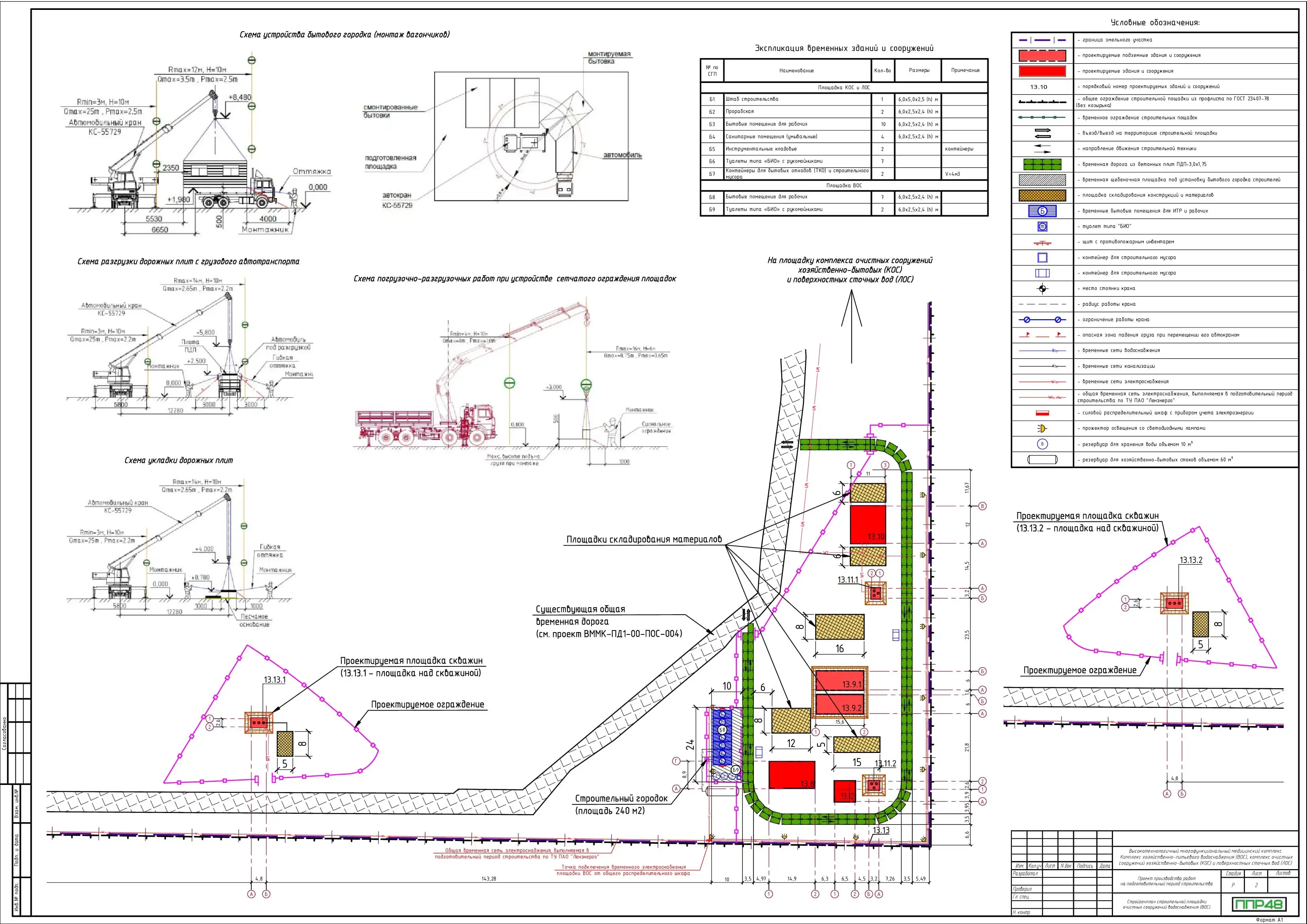 В разработке ППР на устройство строительного городка всегда необходимо учитывать последовательность выполнения работ. Зачастую мы начинаем свою работу с оформления подробного строительного генерального плана, на котором мы указываем размещение временных зданий и сооружений, бытовки, зоны стоянок строительной техники. Также мы отрисовываем в полном соответствии с ГОСТ 21.508-2020 внутриплощадочные дороги, показываем сети временного электроснабжения и электроосвещения.